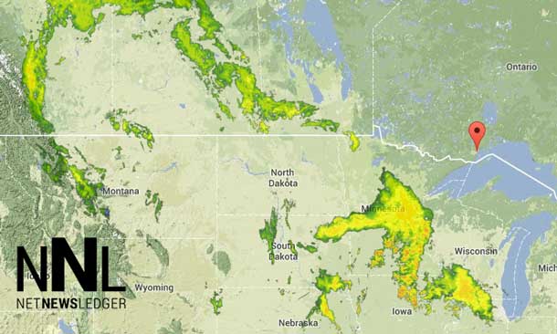 A low pressure system across the northern plain states is expected to bring rain to Northwestern Ontario beginning this afternoon. Latest indications suggest that most areas are likely to receive a total of 20 to 30 mm of rain. Locally higher amounts of 40 mm or more are possible with isolated thunderstorms.
