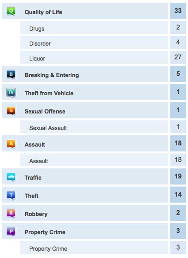 There were five break and enters, and 18 assaults recorded on the crime report.