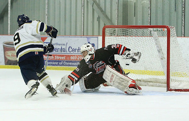 Three minutes after that, the Soo got one back as Eric Hillock drove hard to toward the net and stuffed his effort through the pads of Toronto goaltender Mat Robson.