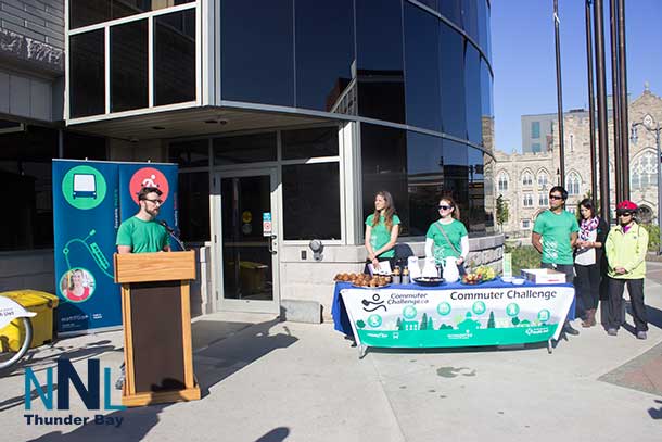 EcoSuperior, in partnership with the Thunder Bay District Health Unit and the City of Thunder Bay kicked off the Commuter Challenge week by welcoming a group of cycling and busing commuters to City Hall with snacks, speakers, and media.