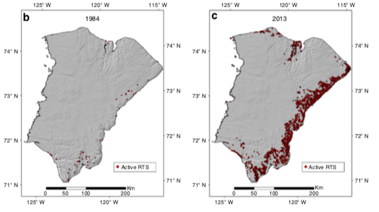The team looked for signs of these landslides in archive imagery of Banks Island between 1984 and 2015. The results were dramatic: in 1984 only 63 active retrogressive thaw slumps could be identified, but by 2013 this number had increased to 4,077 – a 60-fold increase. Mapping the number of new landslides occurring each year over the study period, scientists realised that many more landslides developed in years with particularly warm summers. In the four warmest summers – 1999, 2011, 2012 and 2013 – almost 3,900 landslides developed.