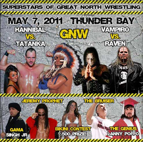The walls of Fort William Gardens will once again rumble with the echoes of body slams. On May 7th, professional wrestling returns to Thunder Bay. The event will feature both stars of the past and present of the sport. Coming to Thunder Bay will be Thunder Bay’s gift to pro wrestling, Vampiro, Raven, Lanny “The Genius” Poffo, Tatanka, The Bruiser, Gama Singh Jr. Jeremy Profit, and the ever dangerous Hannibal.