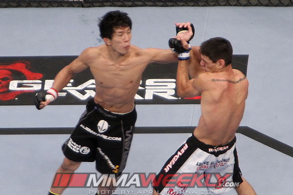 Mizugaki aggressive early, lunging forward with punches clipping Escovedo a couple of times. Escovedo is able to use his knees effectively, but Mizugaki keeps moving forward. The fighters get stuck against the cage in the clinch, Escovedo looking for the Thai plum, and Mizugaki comes over the top with punches. Mizugaki gets a takedown, but Escovedo pops right up. This time Escovedo pulls guard and looks for a triangle choke and Mizugaki shrugs him off and backs out to stand back up. The fighters are trading heavy shots inside, Escovedo lands a nice elbow and Mizugaki fires back with a nasty body shot before the round ends.
