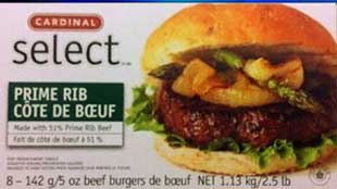 The affected product, Cardinal brand Prime Rib Beef Burgers, is sold in 1.13 kg packages bearing UPC 0 63351 01561 1. The affected product bears the code BEST BEFORE 2013 JL 31 EST 752.
