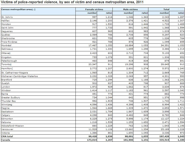 “According to police-reported data, just over 173,600 women aged 15 and older were victims of violent crime in 2011, a rate of 1,207 female victims for every 100,000 women in the population”.