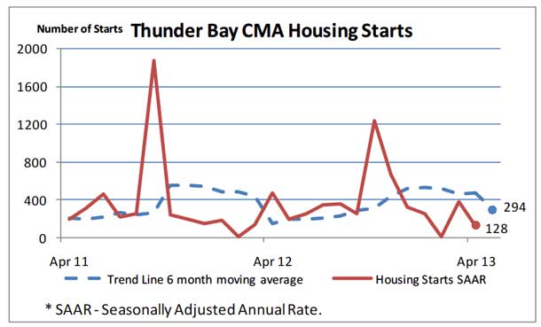 “Housing starts in Thunder Bay, Census Metropolitan Area (CMA) were trending at 294 units in April compared to 479 in March”, according to Canada Mortgage and Housing Corporation (CMHC). “The trend is a six month moving average of the monthly seasonally adjusted annual rates of housing starts”.