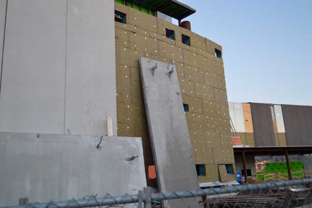 On the east side of the building, the concrete facade is being removed and inspected. Workers have pulled the sides off of the building.