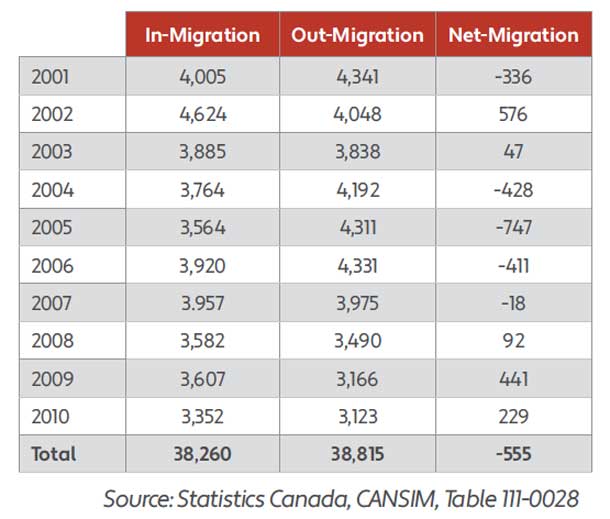 Although the District as a whole is decreasing in population, there is a shift occurring in net-migration for the Thunder Bay CMA. For the third straight year, Thunder Bay CMA has shown a net in-migration. Although stated with caution, the latest numbers added to this table may be indicative of a trend reversal. As the region begins to experience a gradual emergence in key sectors including mining, forestry, and health care, we can expect this trend to continue. Consider that in the 10 year period, almost the same number of people entered the Thunder Bay CMA as had left.