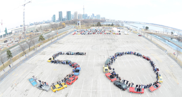 TORONTO – LIVING – 50 years ago, on April 17, 1964, an automotive and pop culture icon was born. To celebrate, Ford of Canada and members of the Golden Horseshoe Mustang Association and GTA Mustang Club took an aerial shot of 25 classic Mustangs forming a ’50’ at Ontario Place in Toronto.
