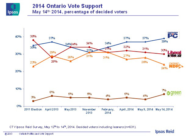 Toronto, ON – Into week two of the Ontario election campaign, a new poll by Ipsos Reid conducted on behalf of CTV News and CP24 finds that Tim Hudak’s Progressive Conservative Party continues to lead the race for Ontario leadership over Kathleen Wynne’s Liberals and that Andrea Horwath’s New Democrats have lost some ground.