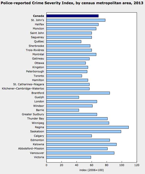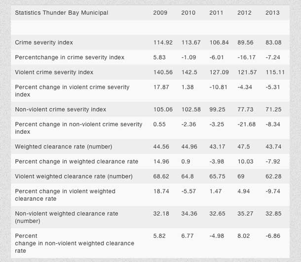 Thunder Bay Police, commenting on the Statistics Canada report say, “Statistics Canada released the 2013 Crime Severity Index today. The index is weighted based on police reported statistics regarding criminal incidents. The severity of the crime is a contributing factor which Stats Canada uses to determine a Severity Index.