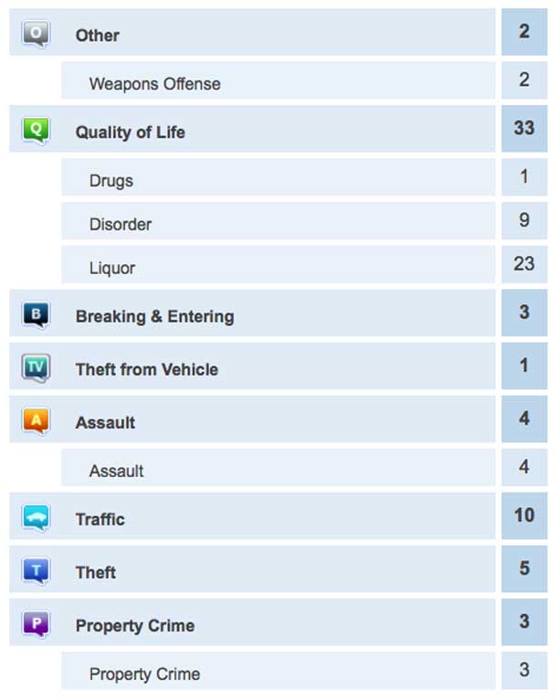 Officers were called out to two weapons offenses, and thirty-three quality of life calls. The majority of those calls were alcohol related.