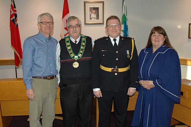 (Photo by P. Howarth, DPS.. L to R DPSB Chair P. Andrusco, Mayor Nuttall, Chief West, City Clerk D. Kincaid.)