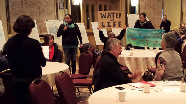 The consultation that evening concluded with an impromptu presentation by a small group of First Nations. They addressed the concern of protecting water and wetlands. One held up a sign saying “WATER IS LIFE”. The presenters received widespread applause, as did many other presenters.