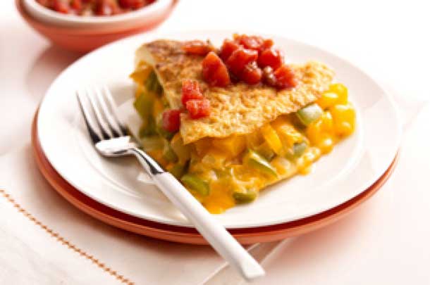 As if red and green peppers don’t make this cheese-stuffed omelet colorful enough, it’s also topped with thick and chunky salsa
