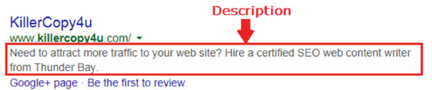 “Your description tag also functions as a Google sales snippet, which is the information that shows up in a search result listing. That information should contain a combination of your keywords, location and a strong call to action. Ex…Call 807 123-4567”