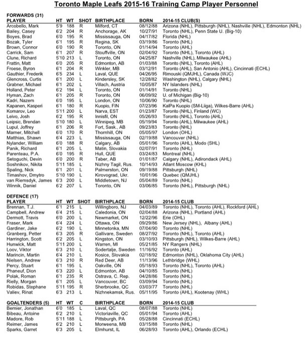 The Maple Leafs current training camp roster includes a total of thirty-one forwards, seventeen defencemen, and five goaltenders.