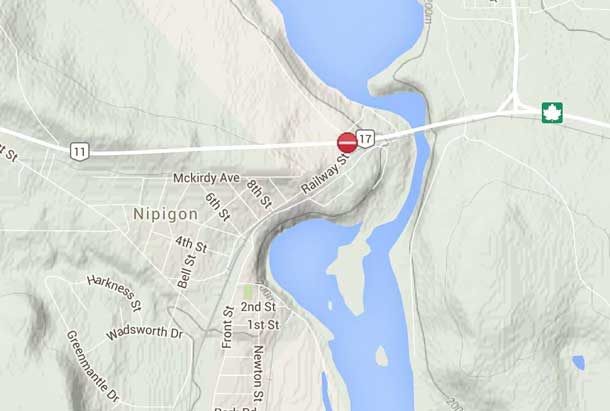 Update – 19:10EST – The Ministry of Transportation advises the motoring public that Highway 11/17 is closed at the Nipigon River Bridge. Safety is our top priority. Conditions are currently being assessed and additional details on estimated time for opening of the highway will be provided when they become available.