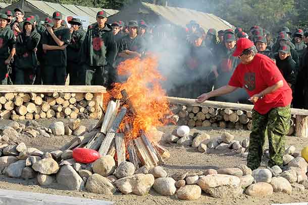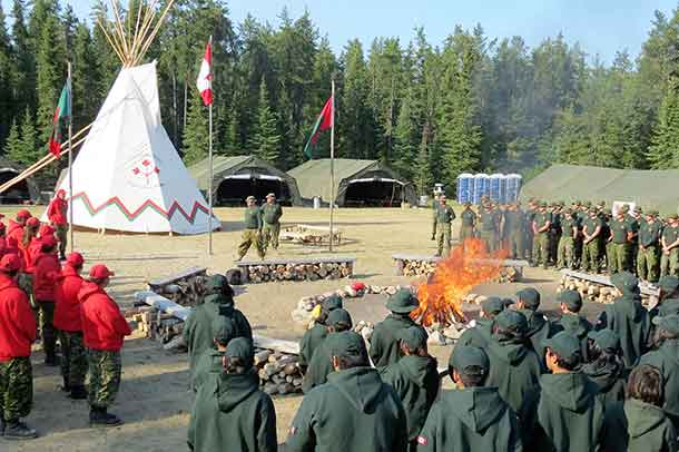 Junior Rangers, Canadian Rangers, and other military personnel formed up in front of a ceremonial fire and 3rd Canadian Ranger Patrol Group’s large tipi to hear a Junior Ranger drum group sing an opening song, listen to a prayer in Oji-Cree from the camp’s Canadian Ranger elder, and see tobacco offered to the fire after it was lit.