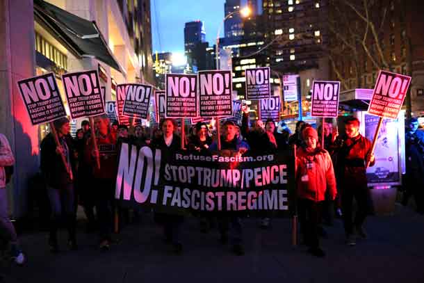 On K Street, best known for its well-heeled lobbyists, about 200 protesters chanted: “No Trump … no fascist USA.” Nearby, Trump supporters – some draped in red, white and blue shirts, hats and jackets – declared their unwavering support for the New York businessman.