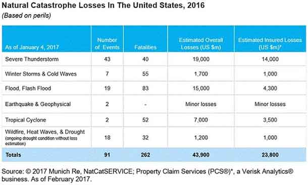 From 1996 to 2015 in the U.S., winter storms resulted in about $30 billion in insured catastrophe losses (in 2015 dollars), or about $1.5 billion a year on average, according to Property Claim Services (PCS).