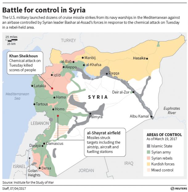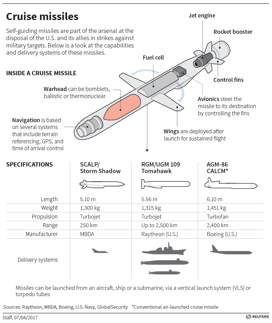 On Thursday afternoon, Trump ordered the launch of a barrage of cruise missiles against the Shayrat air field north of Damascus, which the Pentagon says was used to store the chemical weapons used in the attack.