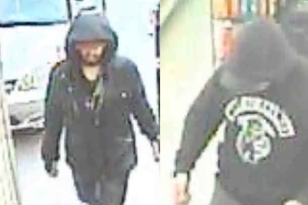 Suspect #1 has an average build, is clean shaven and was wearing a black “Son’s of Anarchy” hoodie with dark pants and a black baseball cap.