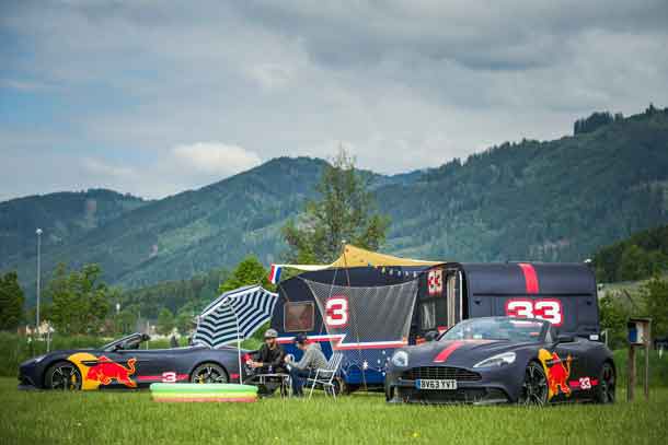 What do you get when you paint a couple of caravans in Red Bull Racing colours, add your race number, hitch ’em up to a couple of Aston Martin Vanquish convertibles with tow bars and race the crap out of them around the Red Bull Ring in Spielberg? Lots of fun, mayhem and a couple of very happy drivers!