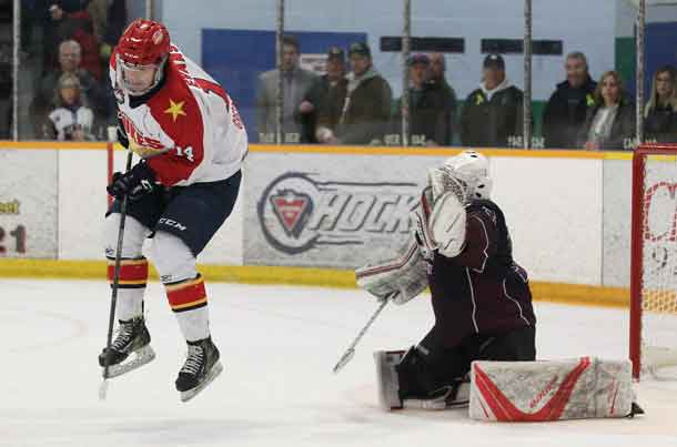 The DHC hosts were quick to extend their lead in the third period as SIJHL MVP Jacen Bracko drove hard to the net and left it for Eric Stout, who made no mistake wiring his attempt between the arm and body at the Wellington goalkeeper to make it 2-0 Dryden 60 seconds into the frame.