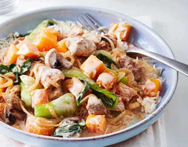Add onion, garlic, ginger and chili powder to wok; stir-fry until onions are softened, about 2 minutes. Stir in pork and squash. Add soy sauce, coconut milk and broth to wok; bring to boil. Reduce heat; cover and simmer over low heat until pork and squash are very tender about 20 minutes. Add mushrooms and bok choy, cook, covered until tender, about 5 minutes. Serve over rice.