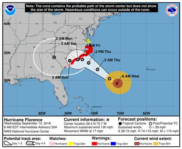 NHC forecasts showed the effects of Florence would be widely felt, with tropical storm-force winds extending nearly 300 miles across three states. A hurricane warning was posted for most of the Carolina coast north to the Virginia border.