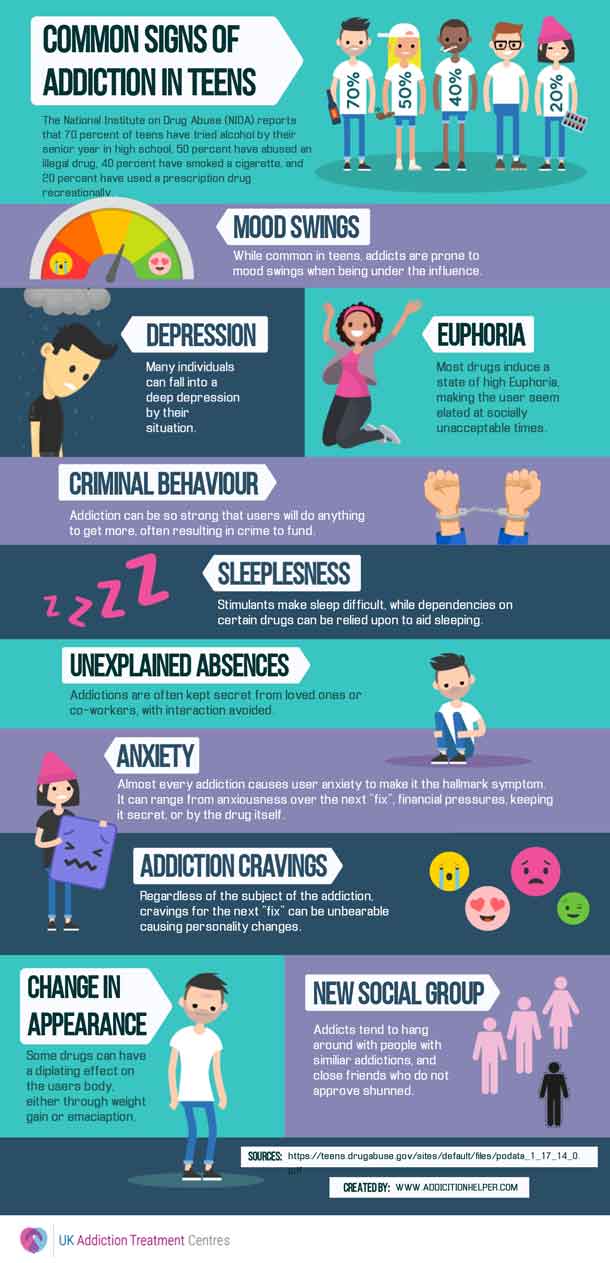 According to research by https://www.ukat.co.uk/ and represented by this infographic, signs of addiction in teens include:
