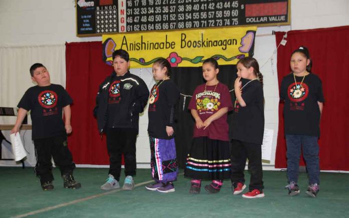 On Tuesday, March 26, students from four elementary schools gathered at the M’Chigeeng Complex to compete in front of an audience, all in their mother-tongue; the Ojibwe Language. Overall, 72 students from Biidaaban Kinoomaagegamik (Sagamok Anishnawbek), Lakeview School (M’Chigeeng First Nation), Shawanosowe School (Whitefish River First Nation) and Bkejwanong Kinomaagewgamig, (who travelled 11 hours from Walpole Island First Nation) proudly presented with their classmates.