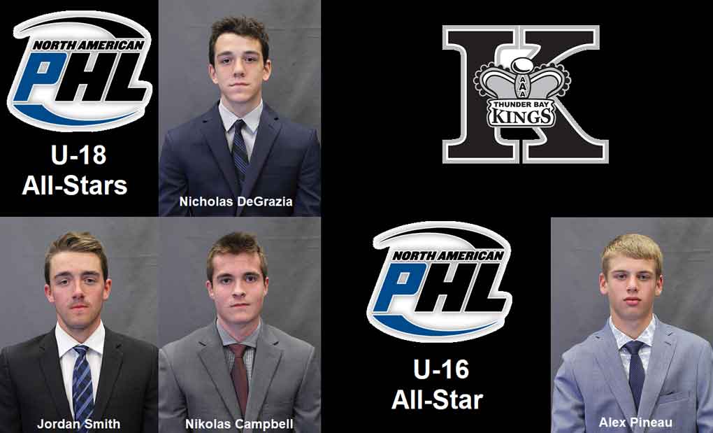The NAPHL-champion under-18 Kings, who are also hosting the TELUS Cup Canadian National Midget Hockey Championship, April 22-28, at the Fort William Gardens, saw three of its players selected to the U-18 Elite all-star squad, in forwards Nikolas Campbell, Nicholas DeGrazia and goaltender Jordan Smith.