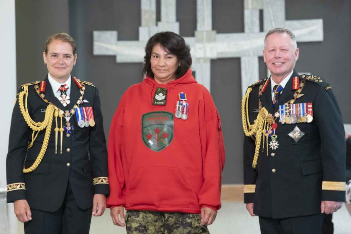 She stood out because she was wearing her distinctive Ranger red hoodie when she was called forward to receive her insignia as a member of the Order of Military Merit from Governor General Julie Payette. She was the only Ranger among the 35 recipients of the national honour.