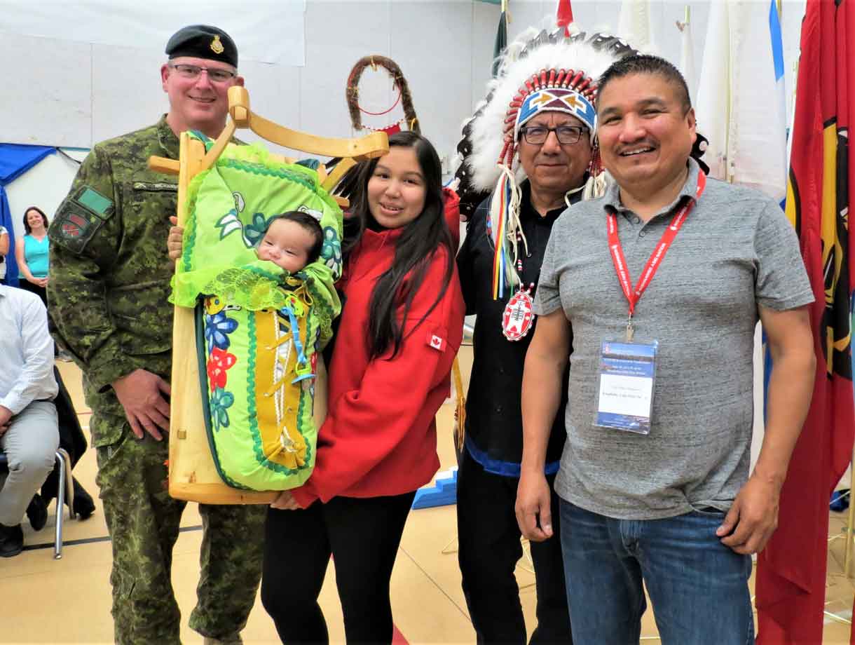 Afterward, she posed in her red Ranger hoodie for photographs with NAN Grand Chief Alvin Fiddler, Colonel Richardson, and Kingfisher Lake Chief Eddie Mamakwa. Then, to applause, she held her two-month-old son Ashton in a traditional Oji-Cree cradleboard for more photographs by relatives and friends.