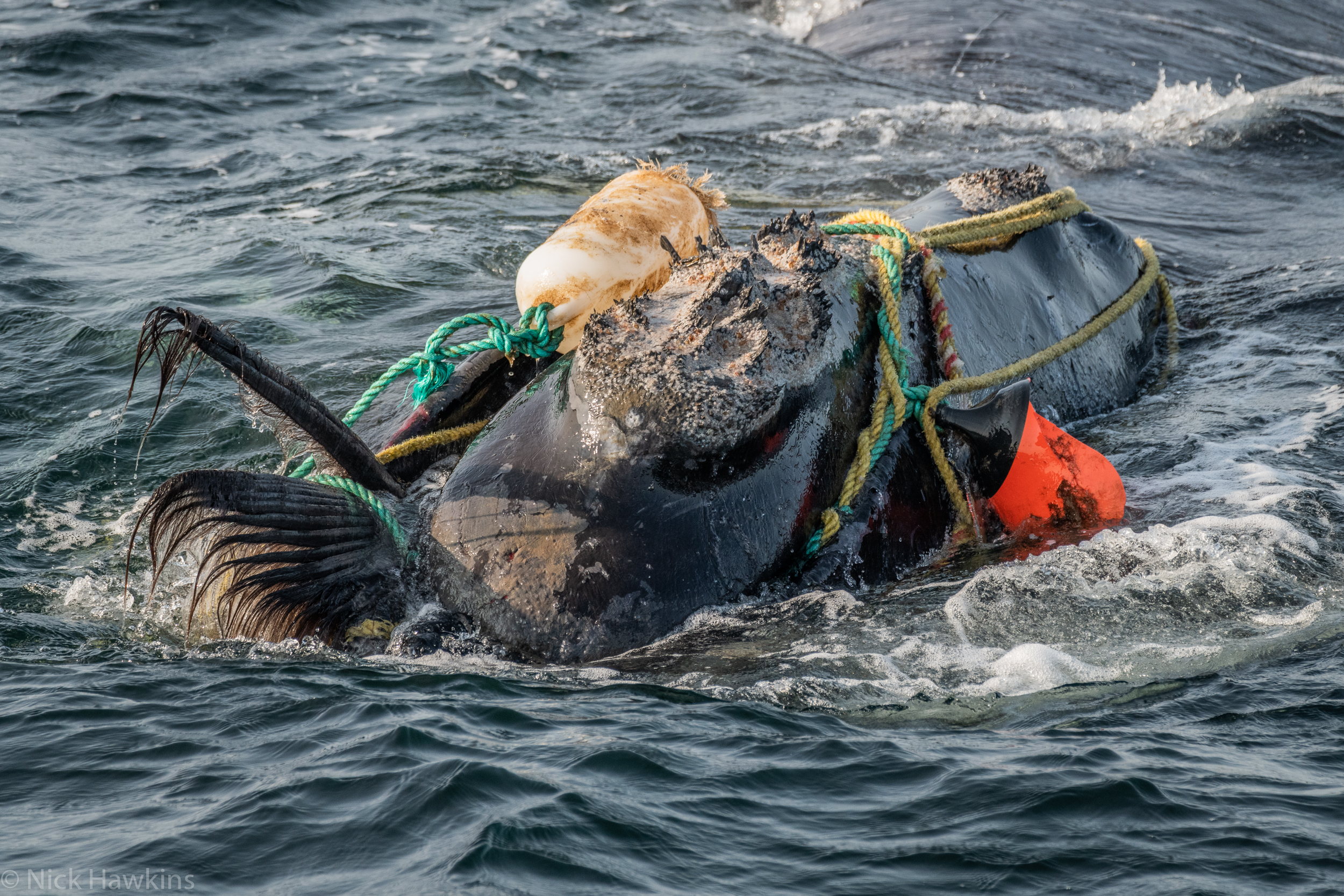 Entanglement in fishing gear used to catch lobster, snow crab and bottom-dwelling fish like halibut, flounder and cod are one of two leading causes of right whale injury and death. Fishing gear from Canada and the U.S. entangles an estimated 100 right whales each year, and about 83 per cent of all right whales have been entangled at least once. Ropes have been seen wrapped around right whales’ mouths, fins, tails and bodies, which slows them down, making it difficult to swim, reproduce and feed, and can cause drowning. The lines cut into the whales’ flesh, leading to life-threatening infections, and are so strong that they have severed fins and tails, and cut into bone.