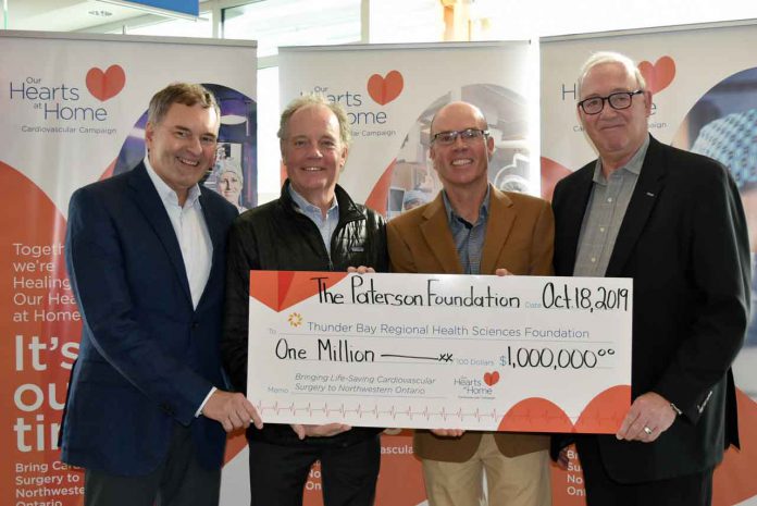 THUNDER BAY – HEALTH – It was with great excitement that The Paterson Foundation announced a $1 million donation to the Our Hearts At Home Cardiovascular Campaign today at the Thunder Bay Regional Health Sciences Centre. Alexander Paterson, on behalf of The Paterson Foundation said, “When we became aware of the cardiovascular surgery program being developed here in Northwestern Ontario, in partnership with the Peter Munk Cardiac Centre, we knew this program would be life-changing for patients needing surgery and their families who want to be by their sides.”