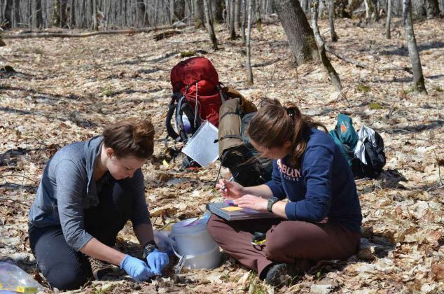 Wolf project technicians Megan Petersohn (left) and Cara Ratterman (right) sample wolf scat detected at wolf GPS cluster site, spring 2019, on Isle Royale. (photo courtesy of Tyler Petroelje, SUNY-ESF)