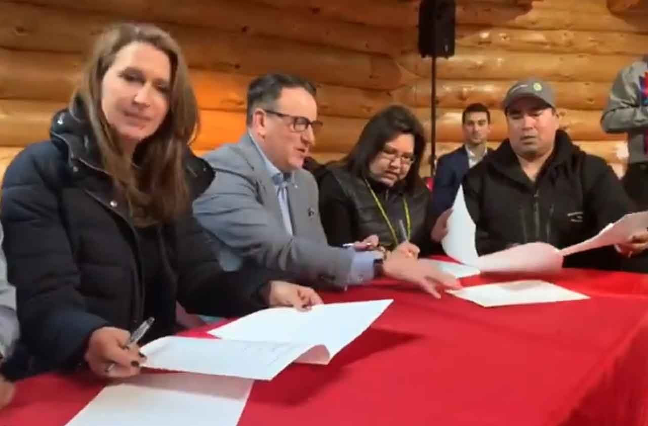 Under the guidance of Elders from the four First Nations, the Ministers participated in a Manito Aki Inakonigaawin (Great Earth Law) ceremony with Ogichidaa Francis Kavanaugh, Chief Marilyn Sinclair, Washagamis Bay First Nation; Councillor Billy Wahpay, Shoal Lake 40 First Nation designate; Chief Chris Skead, Wauzhushk Onigum First Nation; and Chief Lorraine Cobiness, Niisaachewan Anishinaabe Nation. This memorandum of understanding will guide the relationship and the engagement processes for the project in the spirit of co-operation and collaboration.