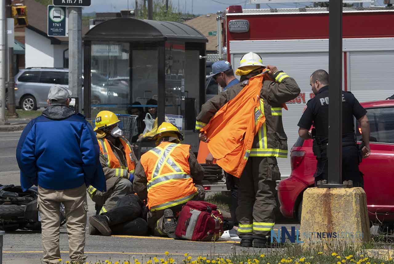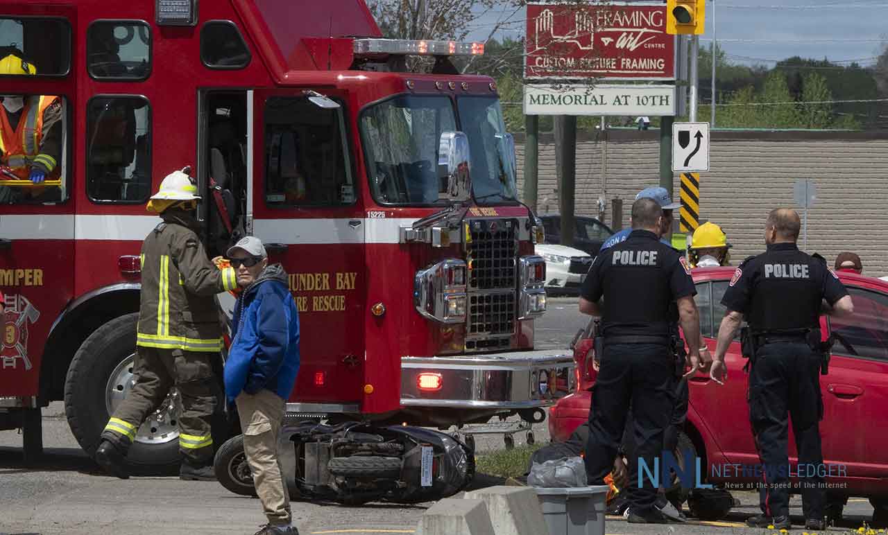 THUNDER BAY – Motorcycles are back on the roads. For both motorcycle riders and automobile drivers being aware is important. On Friday, May 29, 2020, a motorcycle and motor vehicle accident on Memorial Avenue by the Home Hardware location brought out Thunder Bay Police, Thunder Bay Fire Rescue and Superior EMS.