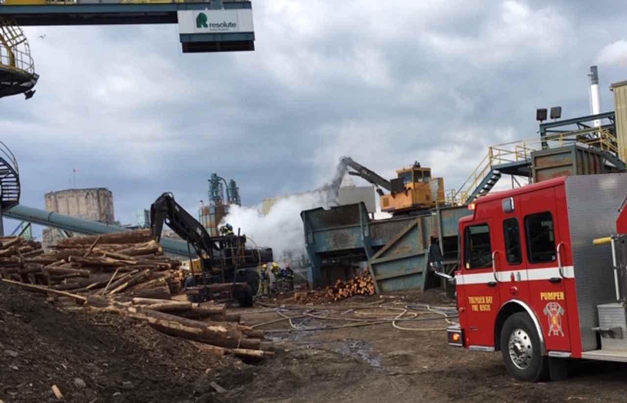 THUNDER BAY – Thunder Bay Fire Rescue Platoon Chief John Kaplanis reports that just after 09:00 AM today, Thunder Bay Fire Rescue responded to a report of a large loader on fire near the main building at Resolute Saw Mill.