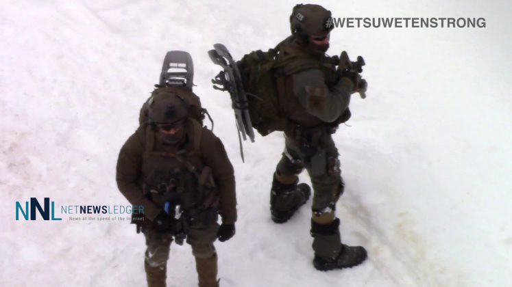 Smithers (BC) – Photographs taken on Wet’suwet’en territory show RCMP armed with assault weapons conducting foot patrols of a cultural site belonging to Hereditary Chief Woos of Cas Yikh (Grizzly House). Security cameras belonging to the Gidimt’en clan recorded images of heavily armed police patrolling Chief Woos’ smokehouse on June 10 and June 18.
