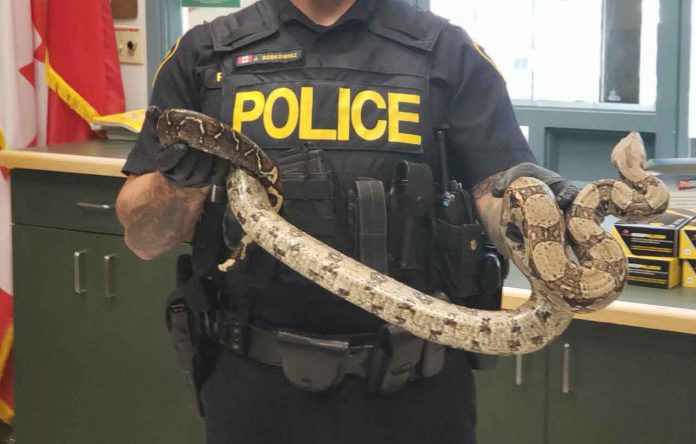 FORT FRANCES – It is one of the more unusual calls for the Fort Frances OPP. It is not everyday officers get to contend with a real snake, in this case, a seven-foot-long boa-constrictor.