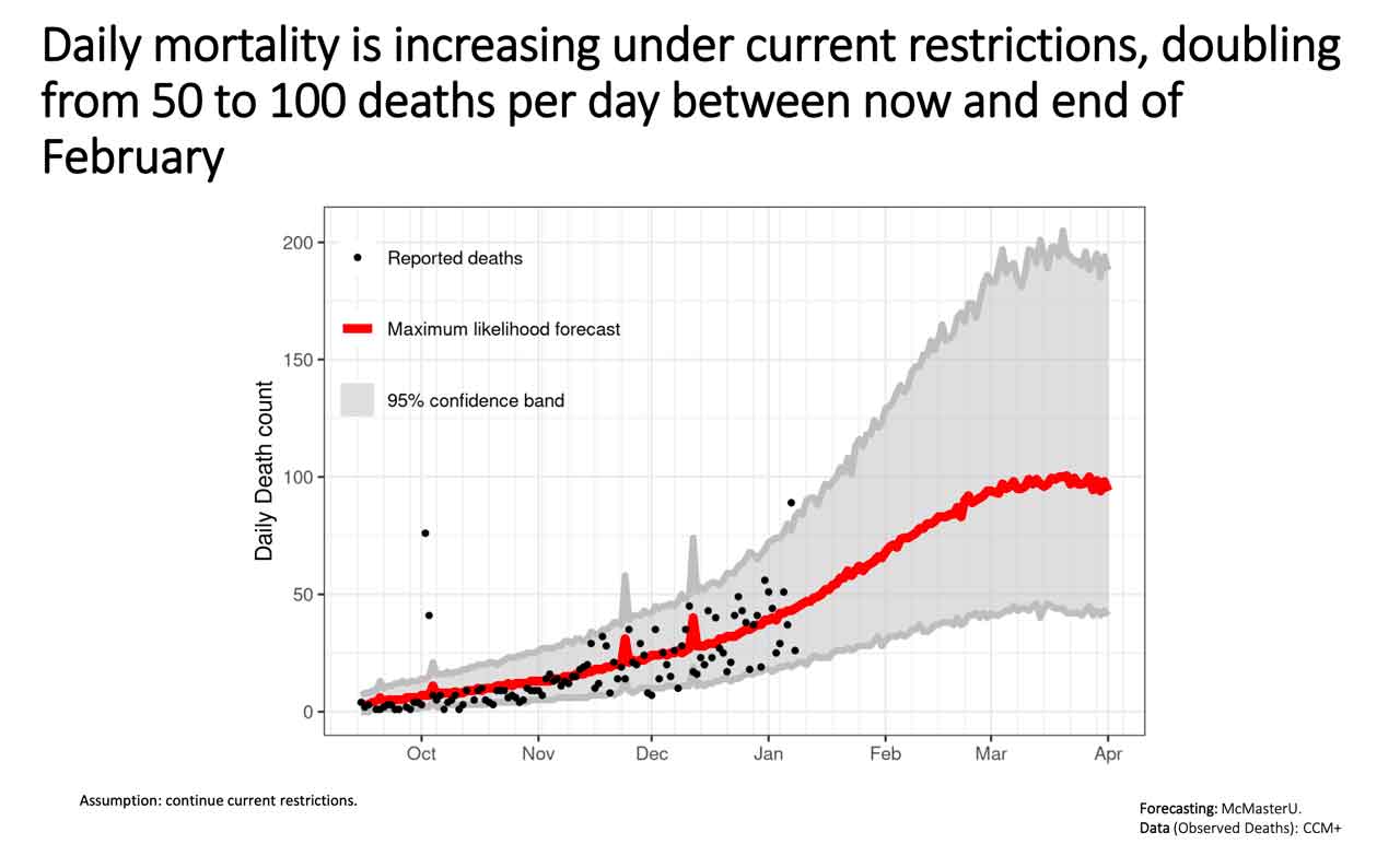 - A new variant of concern of SARS-CoV-2 (B117) could drive much higher case counts, ICU occupancy and mortality if community transmission occurs. The doubling time for cases could drop by more than 2/3. This new variant is now in Ontario.