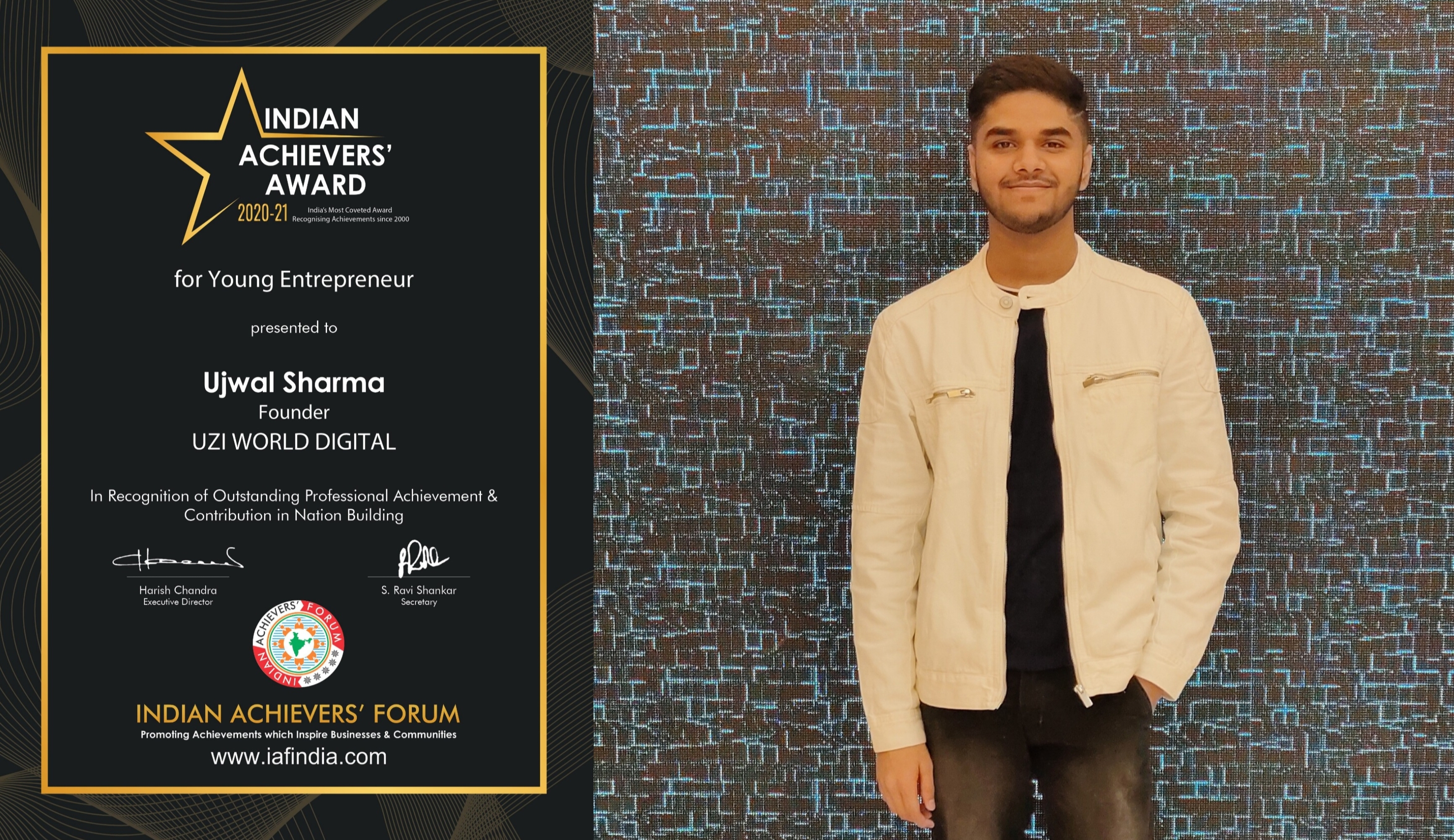 On 4th February 2021, Indian Entrepreneur and Digital Marketer Mentor, Ujwal Sharma won the prestigious Indian Achievers’ Award for Young Entrepreneur in recognition of Outstanding Professional Achievement and Contribution in Nation Building, organized and presented by the Indian Achievers’ Forum.