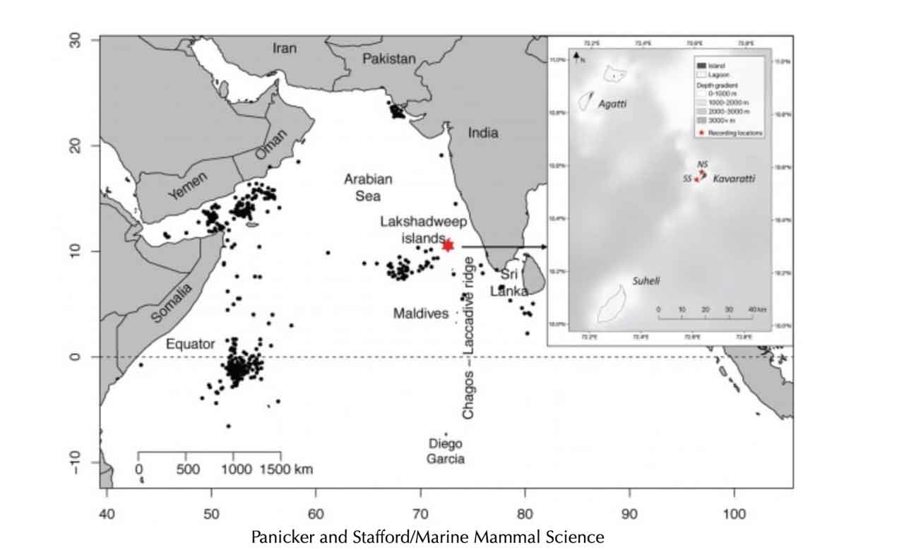 Analysis of recordings from late 2018 to early 2020 in Lakshadweep, an archipelago of 36 low-lying islands west of the Indian state of Kerala, detected whales with a peak activity in April and May.