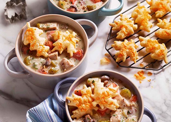 In small bowl, whisk flour into cream; gradually stir into soup, stirring continuously until mixture comes to boil. Simmer gently 2 minutes. Stir in turkey and parsley. Add salt and pepper to taste. Serve soup topped with pastry cut-outs.