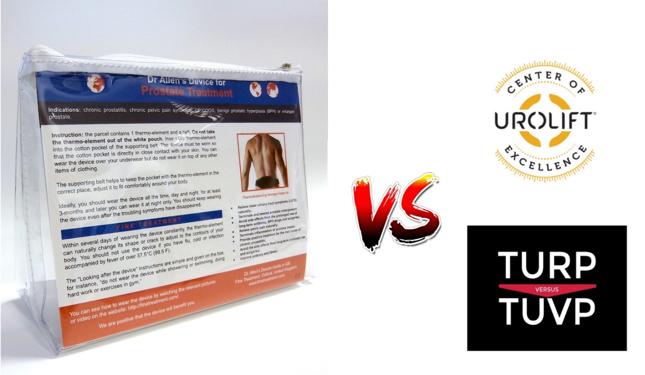 BPU drugs (alpha-blockers and 5-alpha reductase inhibitors) and minimally invasive surgeries for enlarged prostate, which include transurethral resection of the prostate (TURP), Transurethral electrovaporization of the prostate (TUVP) and UroLift, are always compared to each other for their safety. However, the only option treatment for BPH without side effects is Thermobalancing therapy with Dr Allen’s Device.