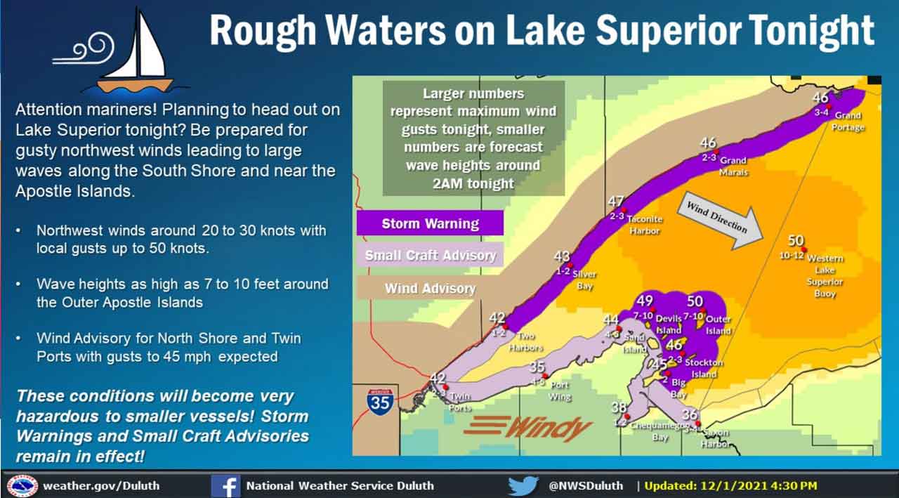 These conditions will be very hazardous to smaller vessels! Additionally, a Wind Advisory is in effect for the North Shore and into the Twin Ports for wind gusts to 45 mph overnight.